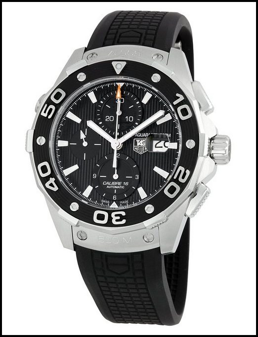 Tag Heuer Men’s CV2A10: This model is one of the most famous in terms of luxury sports. It comes with a sleek look that would suit the classic man. It is made with a combination of a black dial and rubber strap that exudes a bold presence. This watch is for the lion-hearted man, but still offers a lot in terms of style. The hands of this watch are finished with fine silver, and the Arabic numerals are contrasting to the black dial. It comes in a stainless steel case, and has an aluminium coloured bezel. This watch has three different chronograph sub dials, giving you maximum performance.