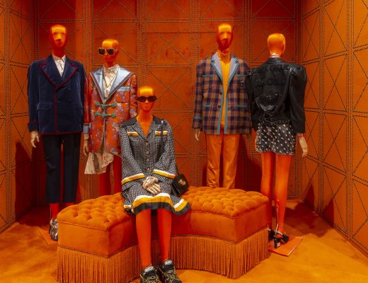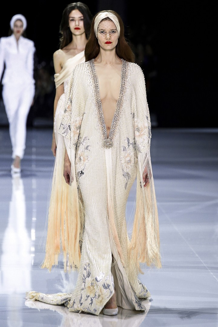 The collection is then defined as “a continued celebration of the many facets of all women and [it] pays homage to the Eastern exploration of Creative Director, Tamara Ralph. Showcasing resonants of traditional Asian decoration punctuated by imperial red silk crêpe, acid green gazar and canary yellow silk satin; the collection is a spectrum of exoticism, with transparent illusion tulle suits, crystal embroidered jacquard and draped kimono-style silhouettes edged in layers of decorative tassels”.