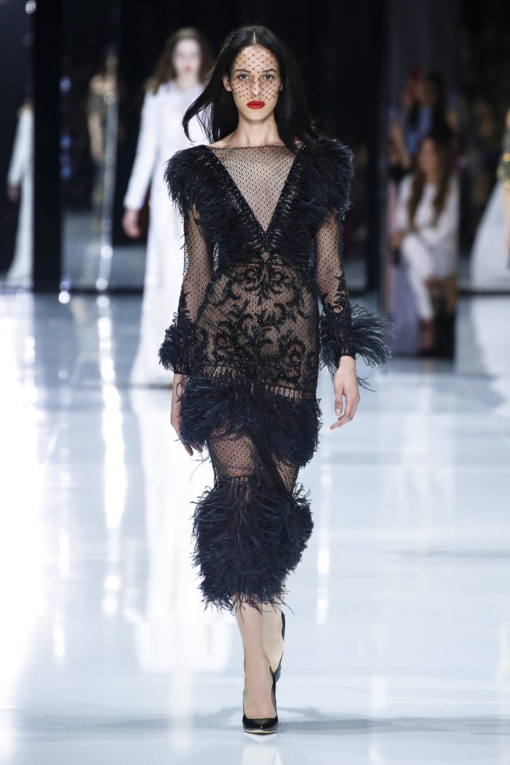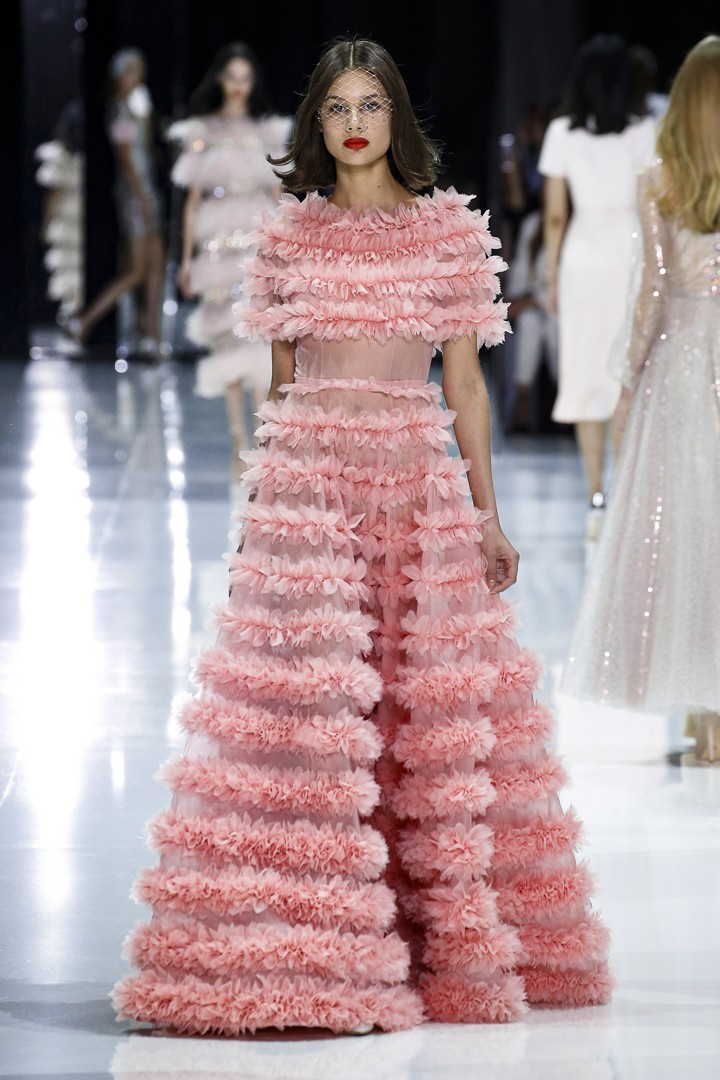 The main colors used are pale pink, white and black, but the three last looks are in cherry red. Off-the-shoulder dresses, silk organza ball gowns and cocktail dresses dominated the scene with Swarovski pearls, devoré ostrich feathers and hand appliqued chiffon ruffles, which are mainly present in the deep coral silk off-the-shoulder gown (look 7). These ruffles are also in Meghan Markle’s engagement dress, who Russo in a pre-show interview stated: “She’s definitely added to our worldwide appeal”. Nowadays, there are rumors about who is going to design Markle’s wedding dress and Ralph&Russo is considered one of the potential designers.