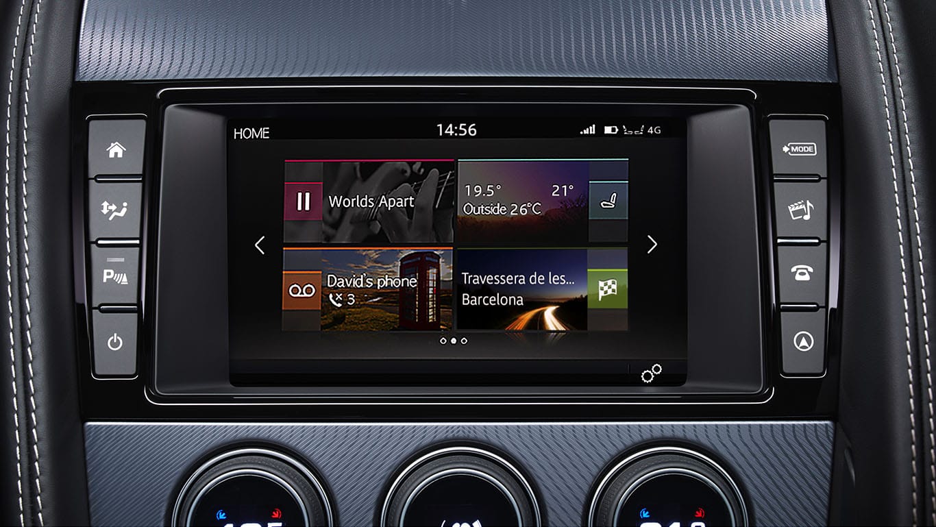 The interior of these superlative F-Types, boasting chrome & aluminum trim, bear lightweight seats in Sport and Performance options. And introduces jaguar’s pad-oriented InControl Touch Pro advertorial system that provides weather reports, real-time traffic functions, and Fuel Finder: a feature that calculates the distance with the driver’s destination and the remaining fuel in the tank, then reports whether or not the fuel is sufficient for the targeted distance of travel. In addition, the new F-Type lineup offers assistance functions such as a semi-automated park-assist and an emergency braking system.