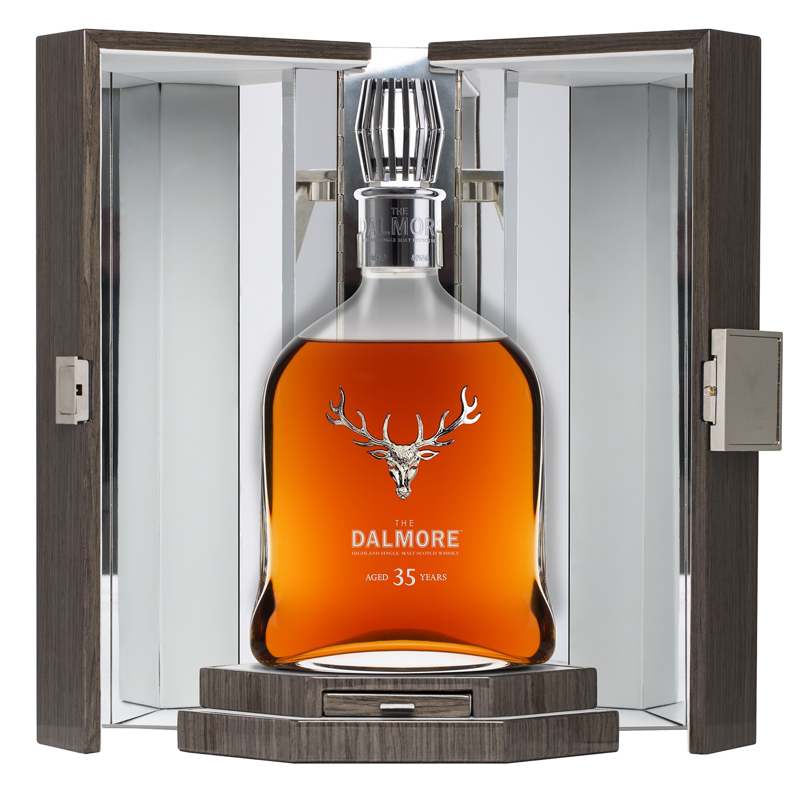 Immersed in an opulent wooden case that holds a hand blown Baccarat crystal decanter with Dalmore’s 12-point stag insignia adorned in sterling silver. Bottled at 80 proof (40 percent alcohol volume), only 1,000 bottles of Dalmore 35 will be available around the world per year for five years, estimated at a retail price of $5,500. This bottle may be thought of as a capstone to Richard Paterson’s semi-centennial experience in whiskey, but don’t get the wrong idea, Peterson doesn’t look like he’s slowing down or taking it easy anytime soon. For the years to come, we’ll be looking forward to see what kind of new, sensational bottles of spirit that Paterson will come up with next time to commemorate future anniversaries.