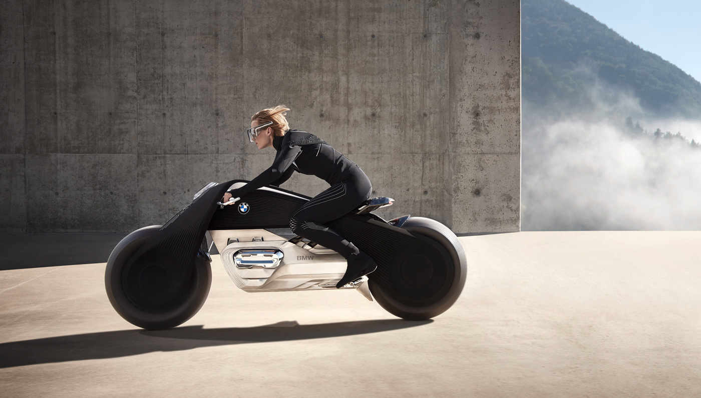 The Vision Next 100 concept bike’s black triangular structure and white lines honor BMW’s first production bike, the striking R32 that was released in the 1920’s-1930’s. The bike substituted a front fork and traditional suspension in exchange for a flex frame that’s connected precisely towards the front wheel. And this let the designers create new steering movements. To improve aerodynamics, a fabric-like fairing adjusts it’s shape depending on speed and the steering angle of the bike.